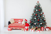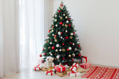 Choinka przy oknie z prezentem wystrój na nowy rok wnętrze kartka wakacje