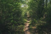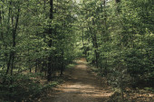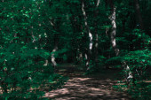 Lekka droga w lesie. Wejście do zielonego lasu z cieniami i słońcem. Pusta droga w tajemniczym lesie latem.
