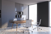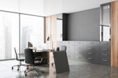 Zdjęcie "Narożnik stylowego biura CEO z szarymi ścianami, drewnianą podłogą, drewnianymi szafkami i stołem komputerowym. Pionowy plakat makiety. Pojęcie przywództwa. 3d renderowanie" może być wykorzystywane do celów osobistych i komercyjnych zgodnie z warunkami zakupionej licencji Royalty-free. Obraz jest dostępny do pobrania w jakości wysokiej rozdzielczości do 5760x3840.