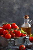 Dojrzałe czerwone pomidory na tacy z butelką oliwy z oliwek. Martwa natura z jesiennymi zbiorami warzyw.