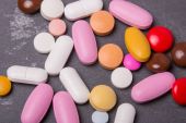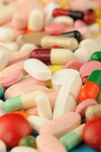 Pigułki kapsułki i witaminy z chorób i wirusów na czerwonym tle. Zbliżenie.