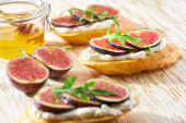 Zdjęcie "Close widok z dwóch kanapek z kozim serem, figa i tymianek na świeżym chrupiącym chlebie serwowane na drewnianym talerzu na jasnoszare plecy" może być wykorzystywane do celów osobistych i komercyjnych zgodnie z warunkami zakupionej licencji Royalty-free. Obraz jest dostępny do pobrania w jakości wysokiej rozdzielczości do 5760x3840.