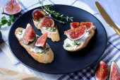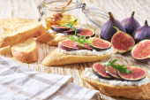 Close widok z dwóch kanapek z kozim serem, figa i tymianek na świeżym chrupiącym chlebie serwowane na drewnianym talerzu na jasnoszare plecy