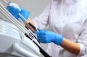 Dezynfekcja sprzętu dentystycznego. Asystent dentysty dezynfekuje instrumenty przed przyjęciem pacjentów. Koncepcja higieny i higieny w klinice. Przestrzeń kopiowania.