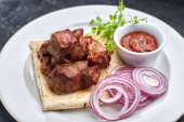 Kebab z josperem wołowym, z orzechami sosnowymi, pitą, sosem i warzywami, na czarnym tle z przestrzenią do kopiowania