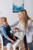 pediatra trzymający aerozol do nosa dotykając nosa uśmiechniętej dziewczyny w ciepłym szaliku