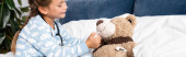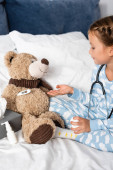 dziecko bawiące się podczas badania pluszowego misia stetoskopem podczas zabawy w łóżku