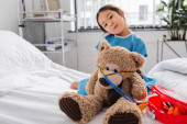 dziewczyna egzaminowanie misiek z stetoskopem podczas gry w łóżku