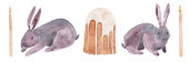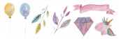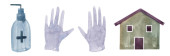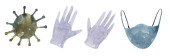Zestaw przedmiotów związanych z koronawirusem. Akwarela rysunek wirusa, maska medyczna, planeta ziemia, środek dezynfekujący, domy. Do projektowania, drukowania.