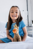 dziecko bawiące się podczas leczenia pluszowego misia sprayem do gardła, baner