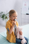 uśmiechnięte dziecko trzyma butelkę pigułek podczas gdy z misiaczkiem w sypialni