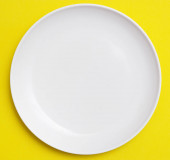 Kobieta trzyma pustą białą płytkę na różowym pastelowym tle. Widok z góry.