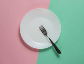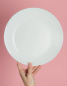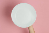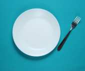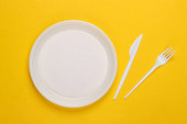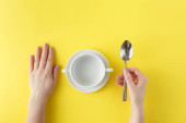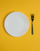 Minimalistyczna koncepcja żywności. Kobiece ręce trzymające widelec i pusty biały talerz na żółtym tle. Widok góry. Układy płaskie