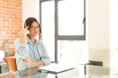 Zdjęcie "młoda ładna kobieta pracuje, uśmiecha się szczęśliwie przyjazny, pewny siebie, pozytywny wygląd, oferując i pokazując obiekt lub koncepcję" może być wykorzystywane do celów osobistych i komercyjnych zgodnie z warunkami zakupionej licencji Royalty-free. Obraz jest dostępny do pobrania w jakości wysokiej rozdzielczości do 5760x3840.