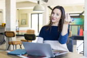 młoda ładna kobieta pracuje, czuje się jak szczęśliwy i podekscytowany geniusz po realizacji pomysłu, radośnie podnosząc palec, eureka!
