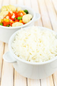 ugotowany ryż z warzywami na drewnianym stole z bliska