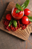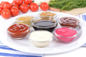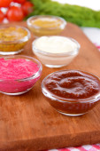 różne sosy na desce do krojenia na stół szczegół