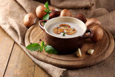 Zupa grzybowa w misce biały, na talerzu, na białym tle