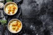 Zdjęcie "Zapiekanka z kurczakiem i grzybami z serem w glinianym garnku. Czarne tło. Widok góry. Przestrzeń kopiowania." może być wykorzystywane do celów osobistych i komercyjnych zgodnie z warunkami zakupionej licencji Royalty-free. Obraz jest dostępny do pobrania w jakości wysokiej rozdzielczości do 5760x3840.
