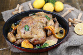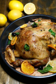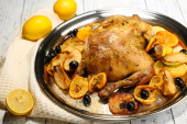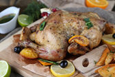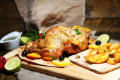 pieczony kurczak z warzywami i ziemniakami na desce, na tle drewniane