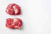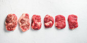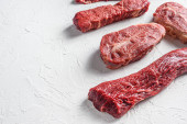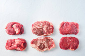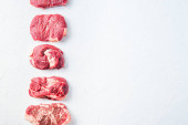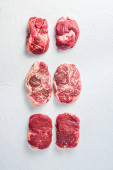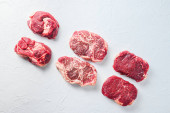 Surowy zestaw alternatywnych kawałków wołowiny Chuck przewraca oczami, górne ostrze, gruby stek. Organiczne mięso. Białe, teksturowane tło. Widok z góry z miejscem na tekst