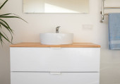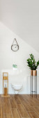 Luksusowa biała łazienka z dużym lustrem powyżej dwóch umywalka i drewniana podłoga
