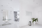 Zdjęcie "Luksusowa biała łazienka z dużym lustrem powyżej dwóch umywalka i drewniana podłoga" może być wykorzystywane do celów osobistych i komercyjnych zgodnie z warunkami zakupionej licencji Royalty-free. Obraz jest dostępny do pobrania w jakości wysokiej rozdzielczości do 5760x3840.