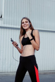 Twarda młoda kobieta w sportowym stroju gapiąca się w kamerę. Sportowiec odpoczywający po treningu na świeżym powietrzu.