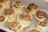 Pyszne okrągłe rolki ciasta z cynamonem na wierzchu posmarowane słodką śmietaną na blasze do pieczenia po piecu. Gotuję bułeczki w domu w piekarniku..