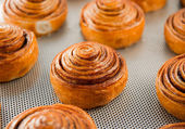 Pyszne okrągłe bułki cynamonowe na blasze po piecu. Gotuję bułeczki w domu w piekarniku..