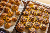 Zdjęcie "Pyszne okrągłe bułki cynamonowe na blasze po piecu. Gotuję bułeczki w domu w piekarniku.." może być wykorzystywane do celów osobistych i komercyjnych zgodnie z warunkami zakupionej licencji Royalty-free. Obraz jest dostępny do pobrania w jakości wysokiej rozdzielczości do 5760x3840.