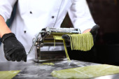 Domowej roboty makaron szpinakowy. Mundurowy kucharz przygotowuje makaron. Nierozpoznawalna osoba. Zdjęcie na czarnym tle.Maszyna do przygotowywania makaronu lub maszyny do makaronu. Przestrzeń kopiowania.