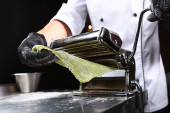Gotowanie domowej roboty makaron z spinach.Green pasty. Nierozpoznawalna osoba. Szef kuchni w mundurze.Maszyna do przygotowywania makaronu lub maszyny do makaronu. Przestrzeń kopiowania.