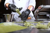 Zdjęcie "Gotowanie domowej roboty makaron z spinach.Green pasty. Nierozpoznawalna osoba. Szef kuchni w mundurze.Maszyna do przygotowywania makaronu lub maszyny do makaronu. Przestrzeń kopiowania." może być wykorzystywane do celów osobistych i komercyjnych zgodnie z warunkami zakupionej licencji Royalty-free. Obraz jest dostępny do pobrania w jakości wysokiej rozdzielczości do 5760x3840.
