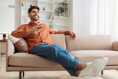 Szczęśliwy czarny nastolatek facet relaks na wygodnej kanapie w domu podczas kwarantanny koronawirus