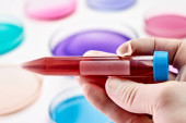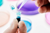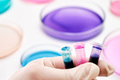 Rurka badawcza z niebieskim płynem w dłoni naukowca na tle płytek Petriego do analizy mikrochemicznej. Opracowanie szczepionki i środków farmaceutycznych.