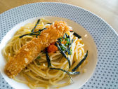 włoskie spaghetti makarony i świeże krewetki pikantne sos, na drewnianej