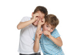 Zdjęcie "Mały zabawny chłopiec w niebieskiej koszulce w paski przyłożył ręce do oczu, przedstawiając lornetkę i pokazuje swój język odizolowany na białym tle.." może być wykorzystywane do celów osobistych i komercyjnych zgodnie z warunkami zakupionej licencji Royalty-free. Obraz jest dostępny do pobrania w jakości wysokiej rozdzielczości do 5760x3840.