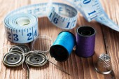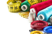 Zbliżenie kolekcji narzędzi do szycia z przędzą, igłami, nożyczkami i miarą taśmy na białym tle z selektywną ostrością