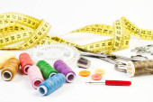 Zdjęcie "Zbliżenie kolekcji narzędzi do szycia z przędzą, igłami, nożyczkami i miarą taśmy na białym tle z selektywną ostrością" może być wykorzystywane do celów osobistych i komercyjnych zgodnie z warunkami zakupionej licencji Royalty-free. Obraz jest dostępny do pobrania w jakości wysokiej rozdzielczości do 5760x3840.