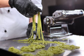Przygotowanie ciasta na spaghetti ze szpinakiem. Naturalny składnik, który jest dobry dla zdrowia. Nierozpoznawalna osoba. Mroczne tło. Maszyna do gotowania makaronu. Widok dolny.