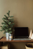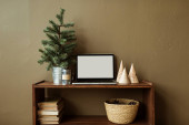 Blank screen laptop z makietą przestrzeń kopiowania na drewnianym stojaku ozdobione jodłą. Minimalistyczna przestrzeń robocza biura domowego.
