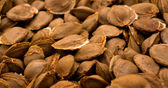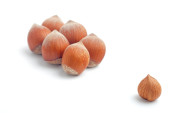 Stos pękniętych łupin orzechów laskowych otaczających całe ziarno na białym z selektywnym ukierunkowaniem