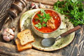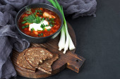 Zdjęcie "Borsch, zupa buraczana w ceramicznej misce na ciemnym tle, tradycyjne danie kuchni ukraińskiej" może być wykorzystywane do celów osobistych i komercyjnych zgodnie z warunkami zakupionej licencji Royalty-free. Obraz jest dostępny do pobrania w jakości wysokiej rozdzielczości do 5760x3840.