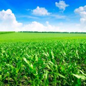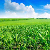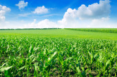 Zielone pole kukurydzy i piękne chmury na błękitnym niebie. Krajobraz rolny.