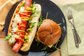 Hamburger z serem na pełnej bułce pszennej z hot dogiem zwieńczonym kiszoną kapustą