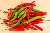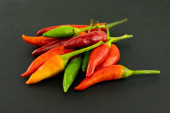 gorące zielone i czerwone papryki chili leżą na czarnym tle, małe strąki podstawy sosu shirachi