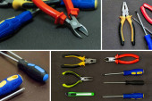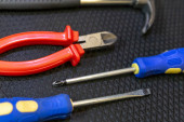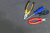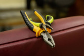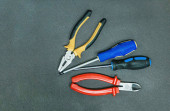 żółte szczypce zestaw narzędzi czerwony suwaki i dwa niebieskie śrubokręty