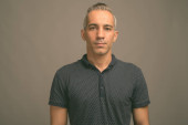 Studio strzał przystojny mężczyzna na szarym tle w czerni i bieli