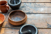 tradycyjne europejskie średniowieczne zastawy stołowe gliniane filiżanki i talerze stoją na drewnianym stole